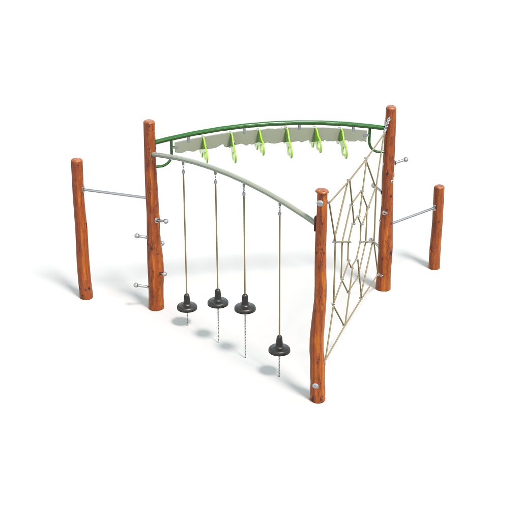 Kanha is a nature-inspired playground structure that invites children to embark on a jungle adventure. Featuring wooden posts, rope nets and pommels, it encourages kids to balance, climb, and explore. The leaf-like elements on the top beam add a whimsical touch, making it feel like a journey through a lush forest. Kanha promotes physical activity, coordination, and imaginative play, transforming any play area into a vibrant and engaging environment.