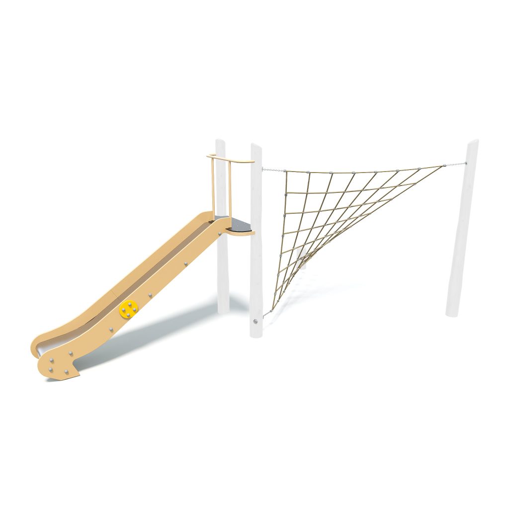 Natural Slide with Twisted Tri introduces a unique climbing and sliding experience. This timber and net structure blends physical challenges with creative play opportunities.