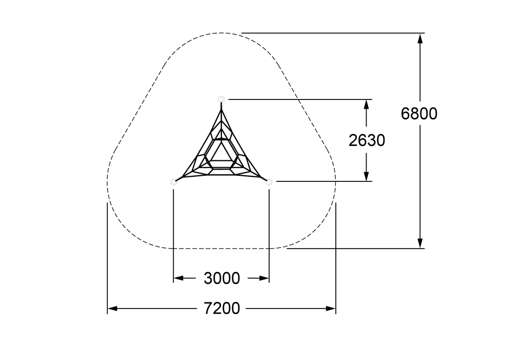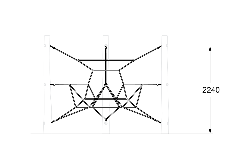 Natural Tricell features a triangular arrangement of timber climbing nets, combining natural materials with geometric climbing challenges.