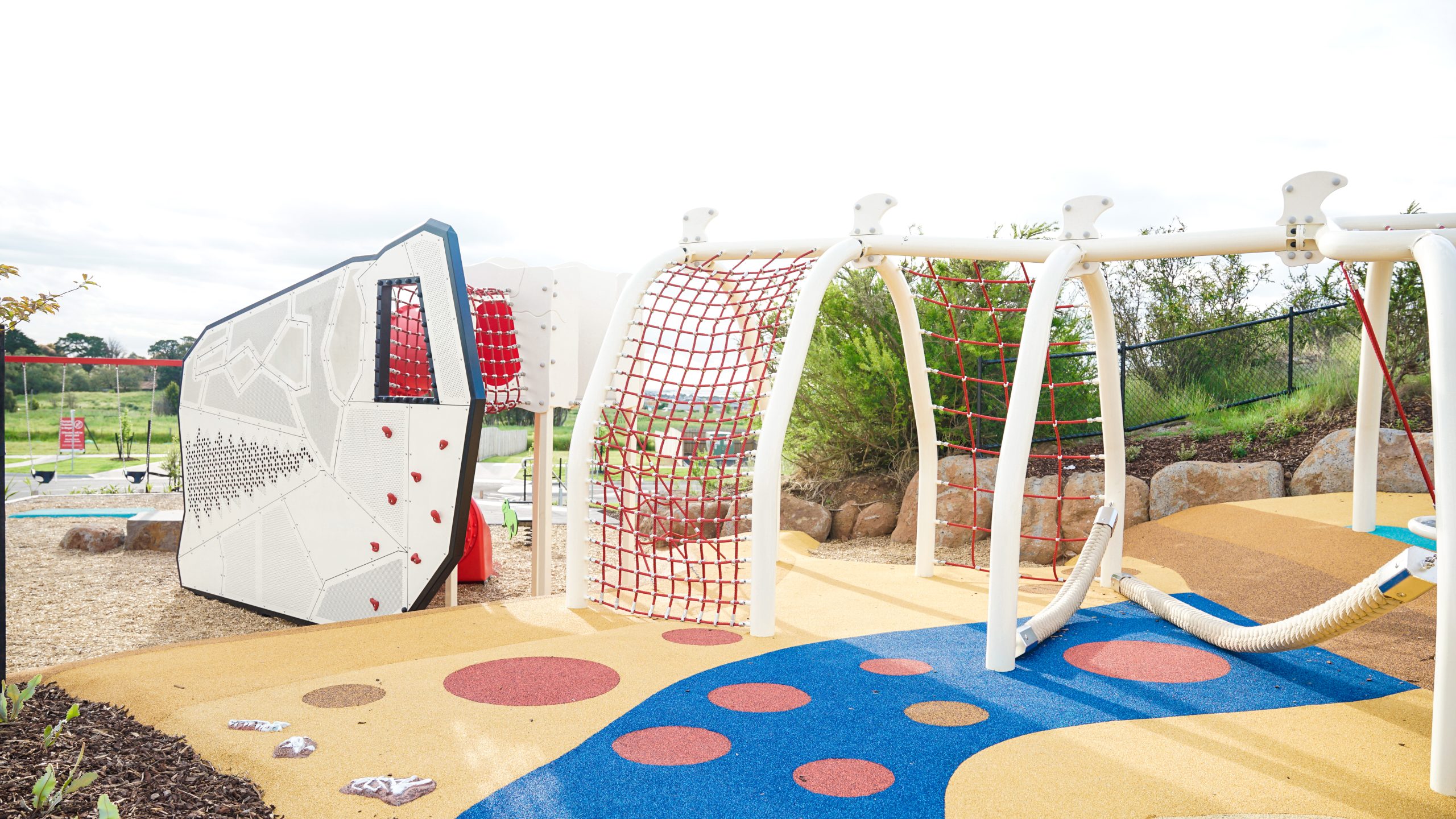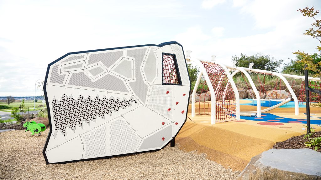 Located in the burgeoning residential development of Donnybrae in Donnybrook, Victoria, a newly completed playground has been given a Jurassic-themed design to give local kids the ultimate play adventure. Billed as a close-knit community, Donnybrae is an exclusive residential development located within the City of Whittlesea. Conveniently located near public transportation, the developing estate will boast future schools, shopping outlets, restaurants, sports facilities, and commercial hubs. But the latest build causing a stir in the public greenspace with colourful playground. The playspace features a series of equipment from conventional and nest swings to springers and inground trampolines, all scattered across a vibrantly coloured softfall surface. At its centre stands a giant elongated climbing centre with the head of a dinosaur! Designed and manufactured by Kaebel Leisure, this striking structure is a custom-designed a riff on their innovative and versatile Spaghetti Structure range.