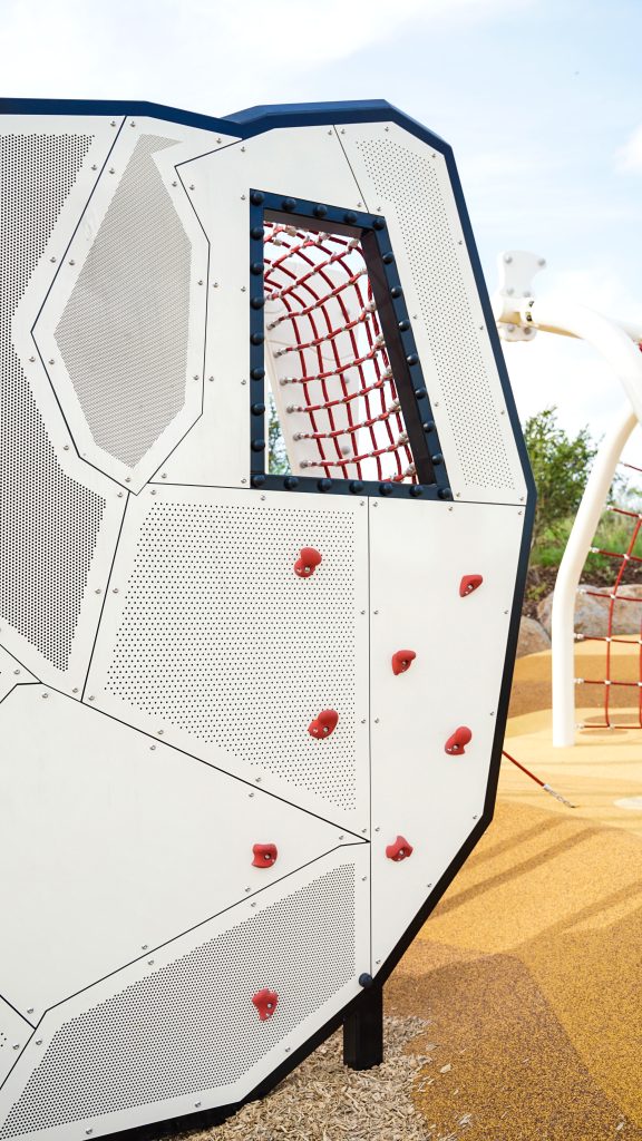 The dinosaur’s head is a masterpiece. The sculptural form was crafted using a heavy steel subframe clad in a variety of perforated metal panels. The perforations form a decorative pattern that give the unit its character, while climbing pegs secured to the panel allow little adventurers to climb Dino’s face up to a netted tunnel.